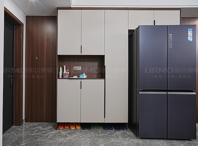 入戶玄關(guān)柜,可作為鞋柜/衣柜/收納區(qū),淺色柜門加深色柜體的碰撞,視覺效果更好,