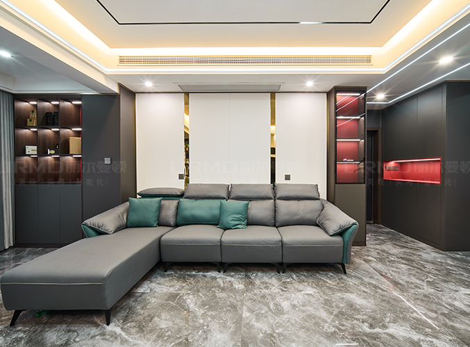 整體的墻柜很好的利用空間,收納大大的提升,擺放上酒或飾品,彰顯出主人的高級品味。