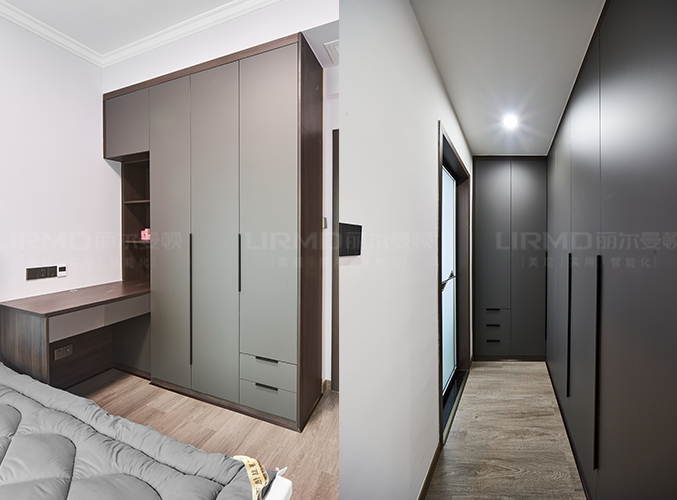 實木柜體搭配PET膚感柜門,收納更方便,左邊配有實木鞋架,深色柜門與紅色內嵌的碰撞,