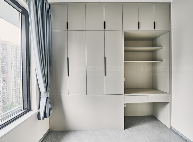 衣柜書桌一體化設(shè)計,右側(cè)定制書桌設(shè)計,學習辦公兩不誤,實木柜體搭配PET膚感柜門,