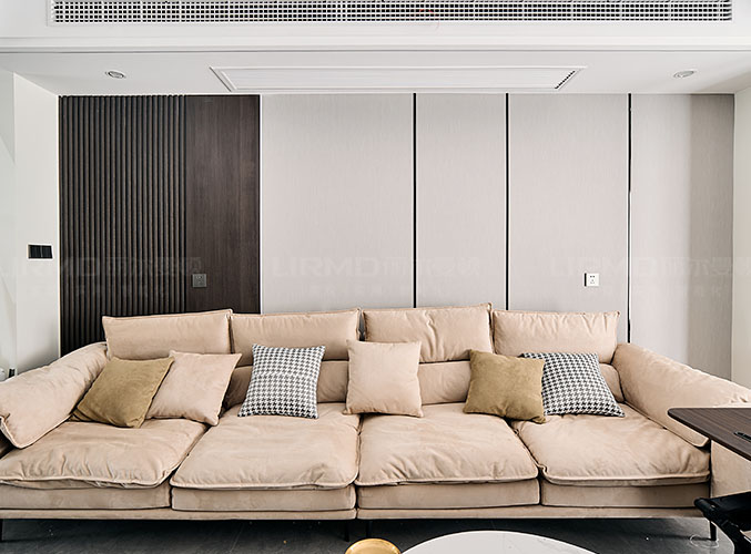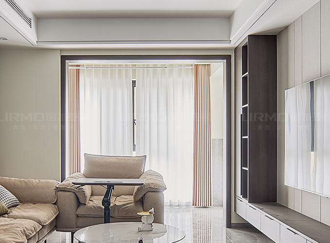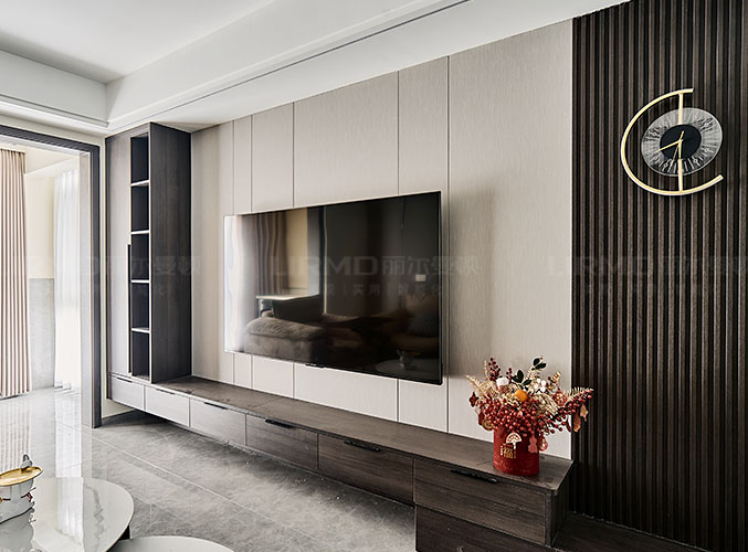 電視背景墻采用整面墻做儲物柜設(shè)計(jì),整體效果不顯沉悶。