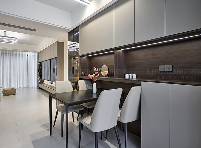 整體的墻柜很好的利用空間,收納大大的提升,內嵌餐邊柜搭配玻璃展示柜,餐桌椅選用同色系