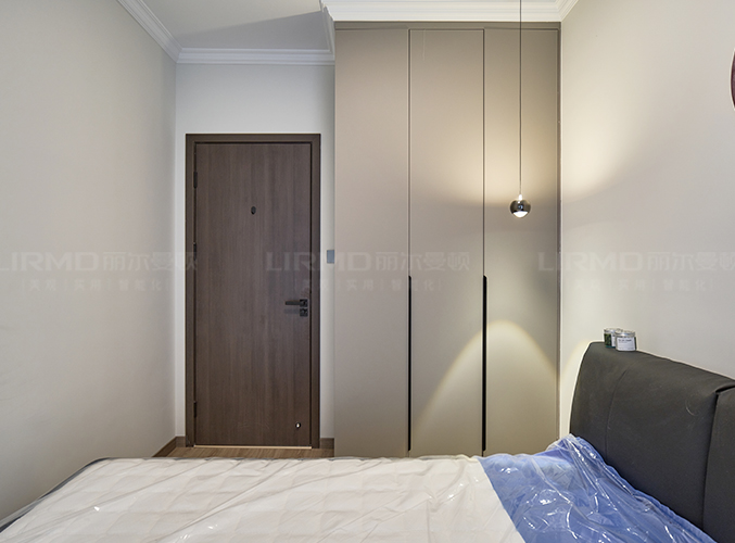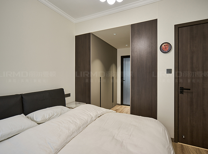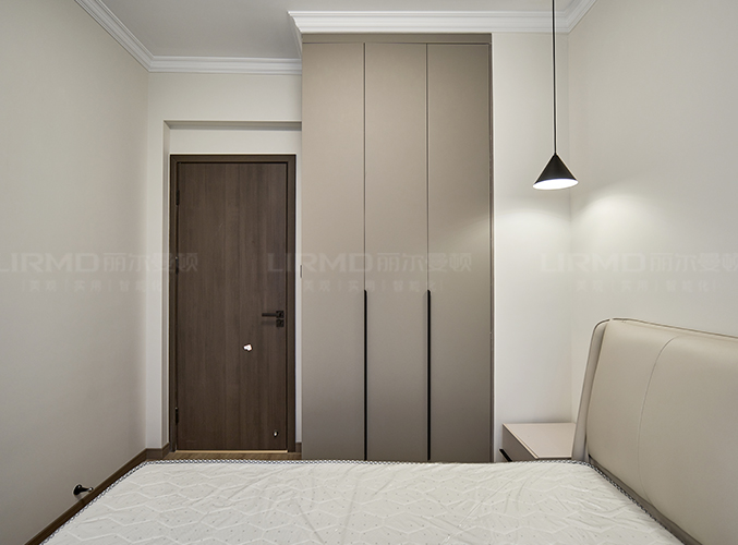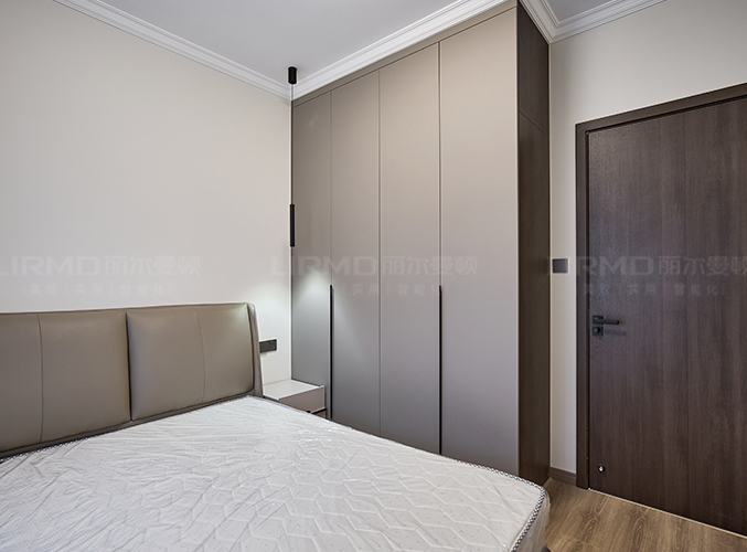 臥室延續極簡風格,衛生間通道兩側到頂衣柜做衣帽間,暖色燈光搭配木紋地板營造溫馨氛圍。