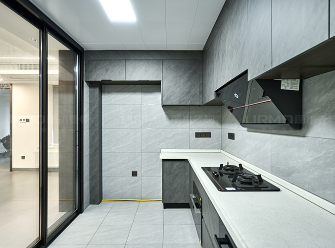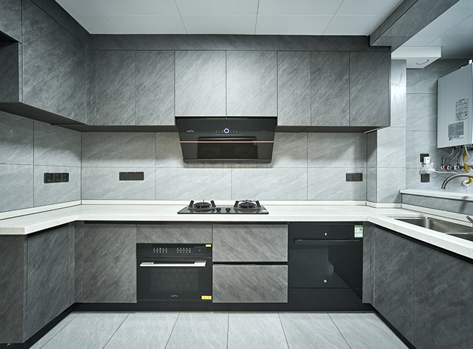 U型設計,櫥柜灰色超晶飾面搭配淺色橫磚整體統(tǒng)一,上下都有柜子,方便收納。
