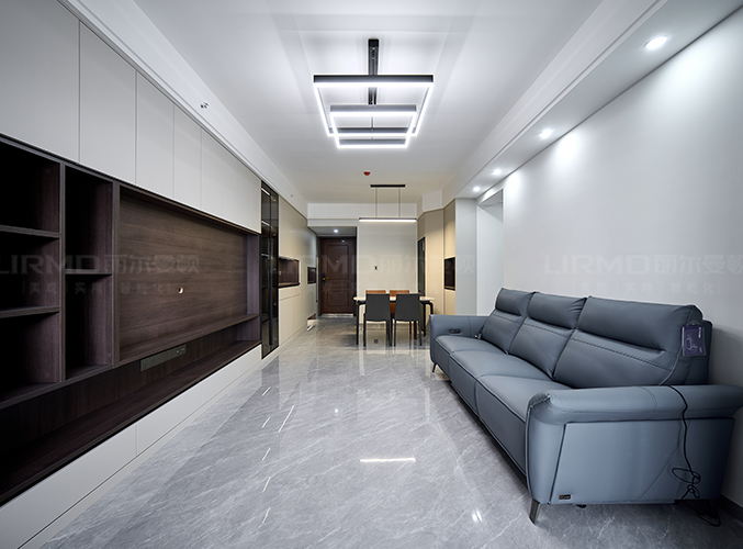 整屋通鋪瓷磚,盡顯大氣,電視背景墻采用整面墻設計,整體效果不顯沉悶,