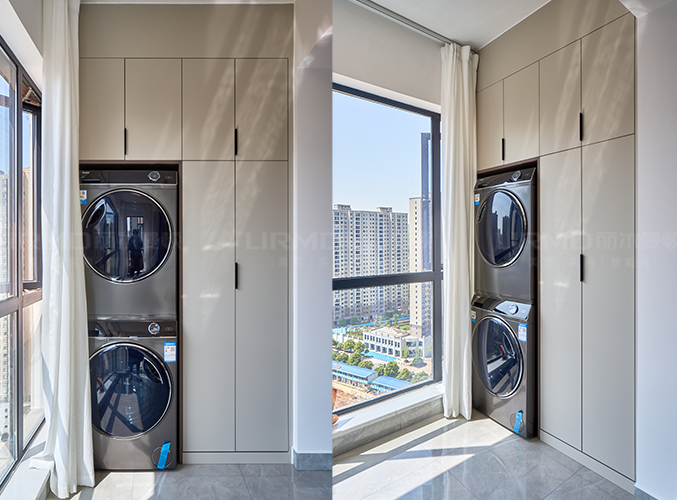 陽臺洗衣機一體柜,側面做收納區,可以提前預留洗衣機和烘干機位置。