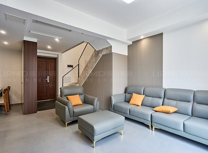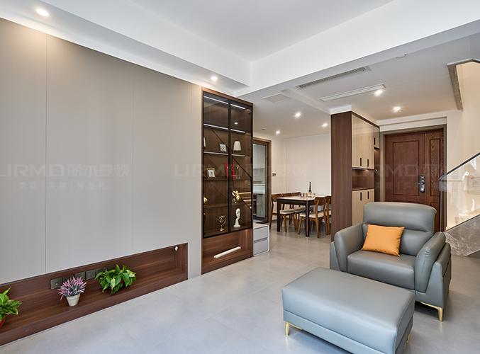 整屋通鋪瓷磚,盡顯大氣,電視背景墻采用整面墻設計,整體效果不顯沉悶,