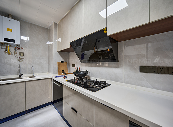 上下方都有收納柜,視覺層次更加豐富,搭配大理石臺面美觀又實用,內嵌式冰箱設計,不占空間。