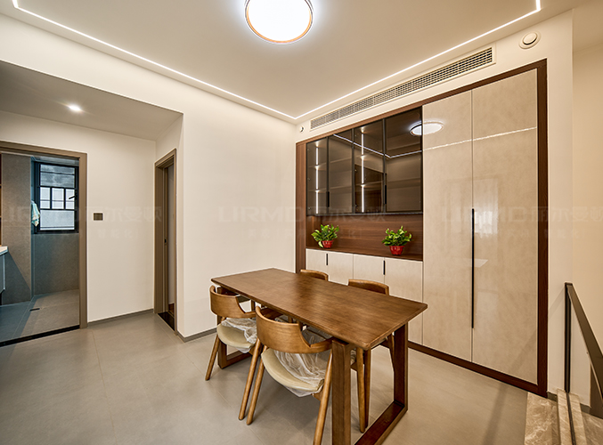 二樓樓梯口裝整墻餐邊柜,方便收納。