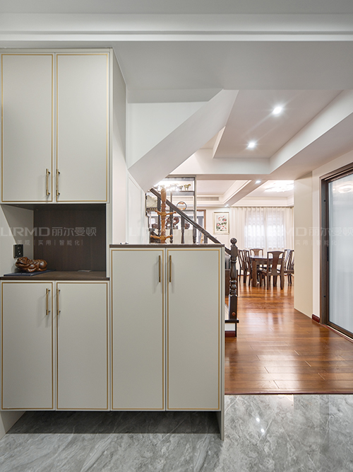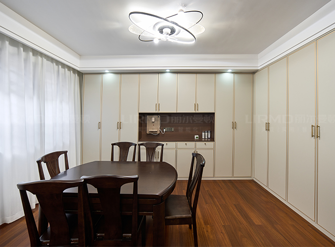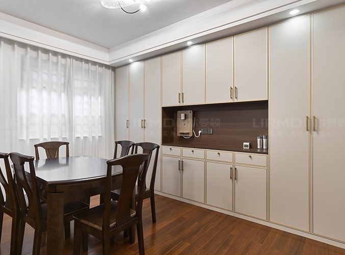 餐廳整墻做餐邊柜,白色柜門鑲嵌金屬邊框,分段造型柜門設(shè)計僅限優(yōu)雅檔次。
