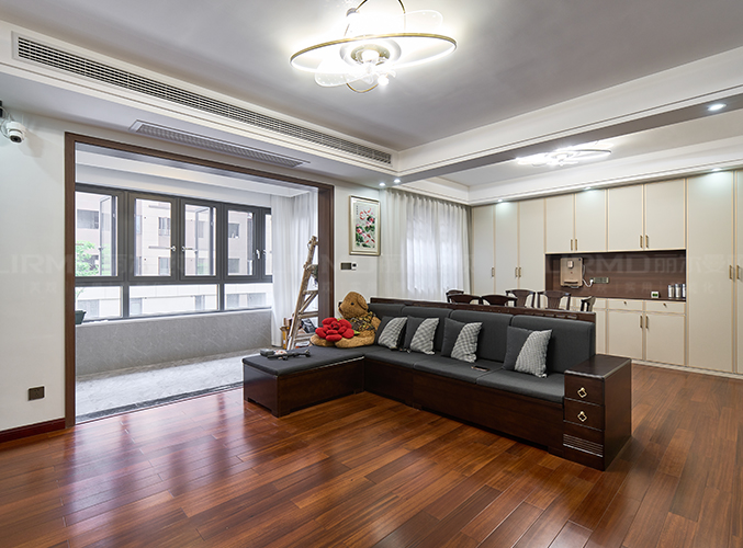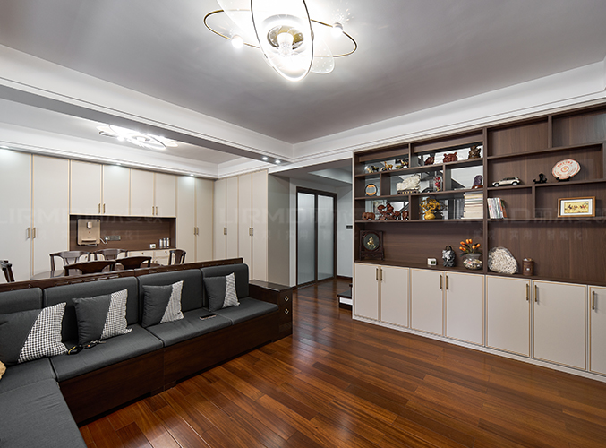客廳鋪設(shè)木地板搭配山水畫電視墻,吊燈設(shè)計,增強(qiáng)照明實用性的同時又增貼了空間藝術(shù)感。