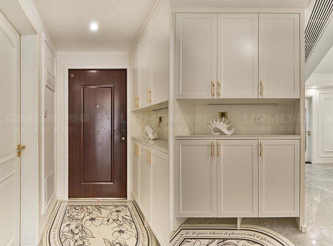 奶油色鞋柜搭配置物花紋腳墊,柜子中間內嵌設計,可以放置鑰匙包包等物品,