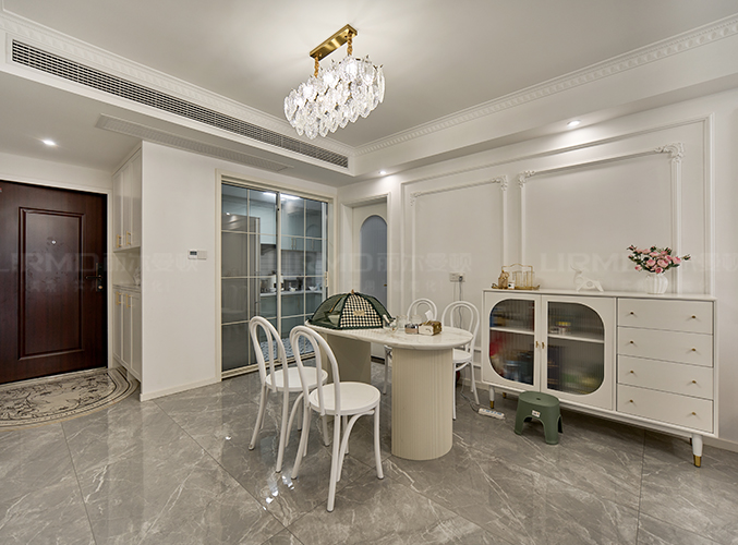 餐廳比鄰廚房,餐桌椅選奶白色及線條圓潤柔和的造型,與周圍法式風格相呼應。