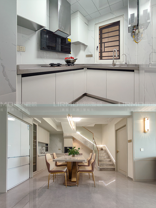 西廚是餐島一體設(shè)計,獨立邊柜設(shè)計了輕電器區(qū)以及水吧位置,