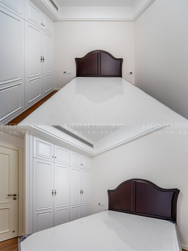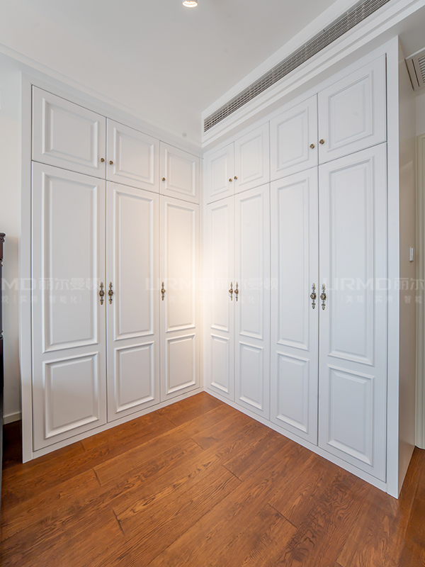 主臥帶L型獨(dú)立衣帽間,柜體柜門(mén)同色系配上銅色拉手點(diǎn)綴