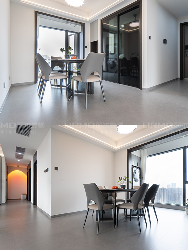 走道一門到頂房門,搭配落日燈,氛圍感十足