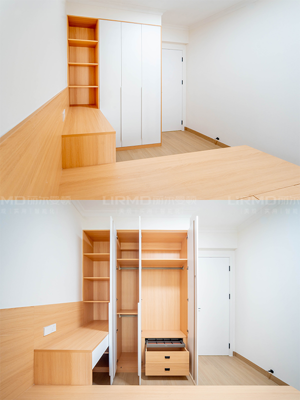 高端全屋定制:柜體板材為十環認證的萬象天冠18mm厚杉木芯板、柜門是歐松板雙飾面門、奧地利進口百隆五金。