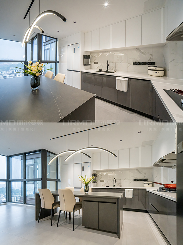 進(jìn)門右手邊是整套定制開放櫥柜+餐島臺一體設(shè)計,