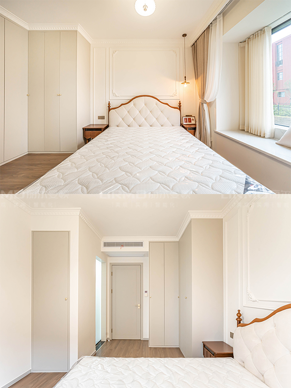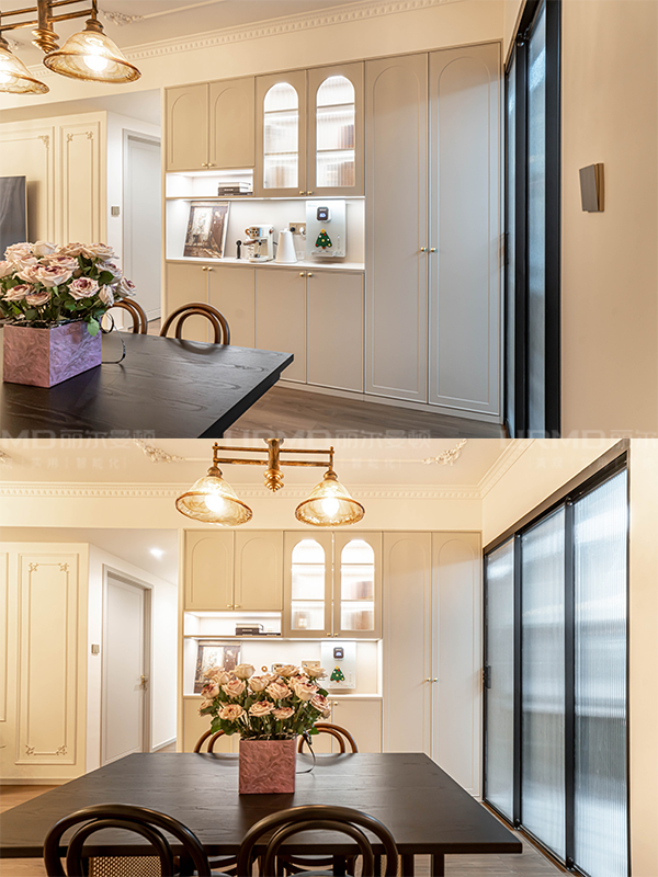整體定制采用象牙灰加同色系柜門(mén),搭配圓柄金屬拉手,增加了法式的優(yōu)雅