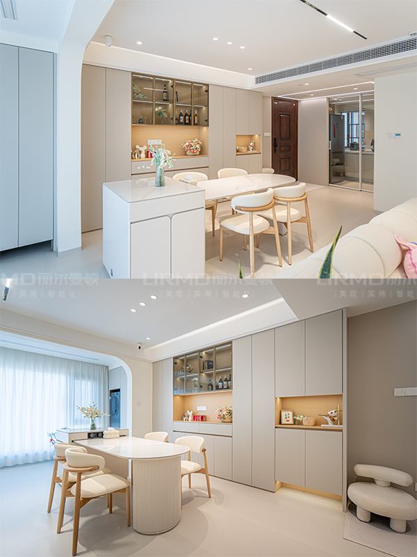 客廳采用無主燈設計,整體燈光更柔和,客餐廳連接陽臺用弧形拱門做隔斷