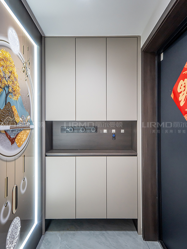 炫光裝飾畫搭配燈帶,氛圍感拉滿,右邊就是玄關鞋柜,便捷方便