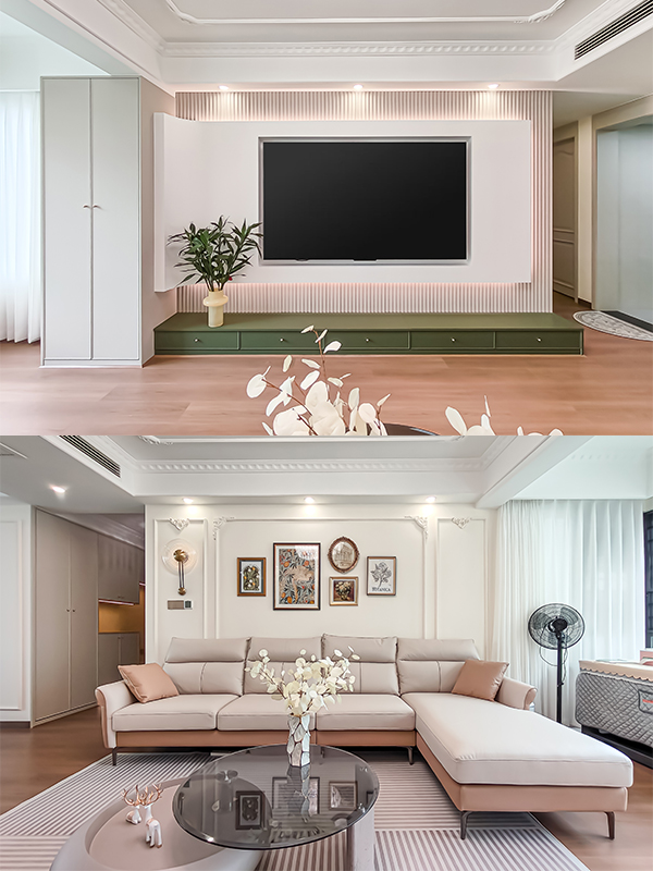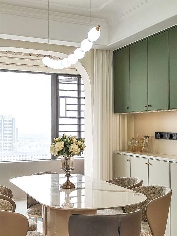 淡奶油色的墻面+地面木地板橄欖綠,跳脫出傳統現代法式的淺色單一元素,給法式的優雅增添一份清新的美感
