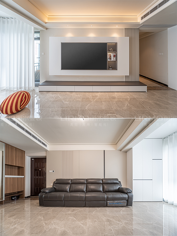 電視背景墻打破傳統形式,懸于半空,延伸出墻體之外,為空間帶來更多的自由和開放感