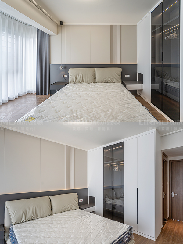 床頭做轉角置物柜式床頭柜,懸空不落地,搭配玻璃柜門一門到頂衣柜,一柜搞定置物和收納