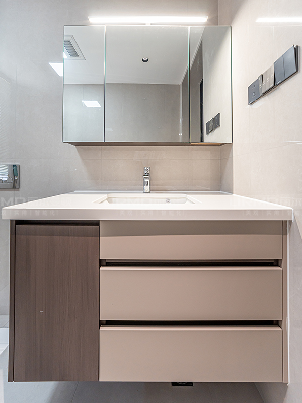 懸浮大理石電視柜與木質的溫暖搭配,營造出沉穩內斂之感