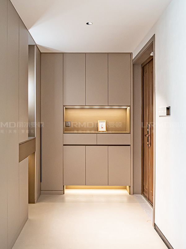 改造L型玄關(guān)收納柜,玄關(guān)柜采用穿插設(shè)計(jì)手法,打破常規(guī)鞋柜格局,呈現(xiàn)進(jìn)門即是景的視覺沖擊力