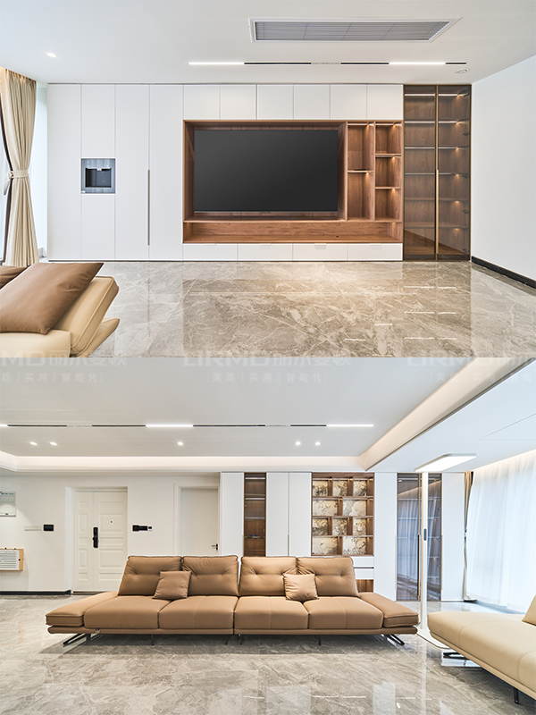 沙發(fā)背景和電視背景互相呼應(yīng),做同色設(shè)計(jì),格柵+巖板進(jìn)行局部點(diǎn)綴,增添亮點(diǎn)