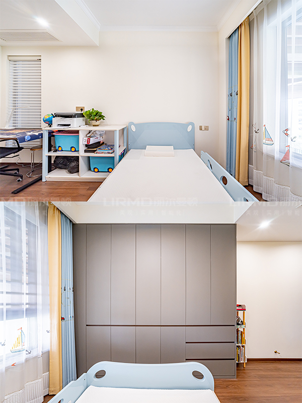 主臥色調與客廳統一,使整體空間更加和諧。二樓公共區為書房空間,整體為淺色系,營造出寧靜的氛圍。陽光灑在書桌上,溫暖柔和。