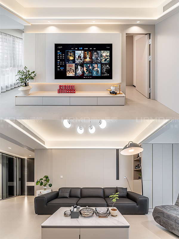 石膏板做成懸浮設計。電視內嵌,內含燈帶