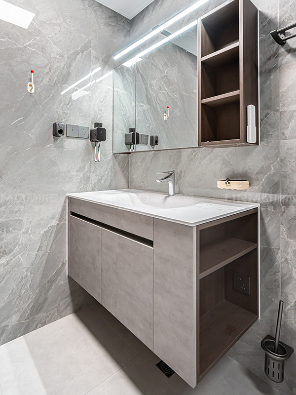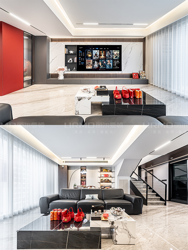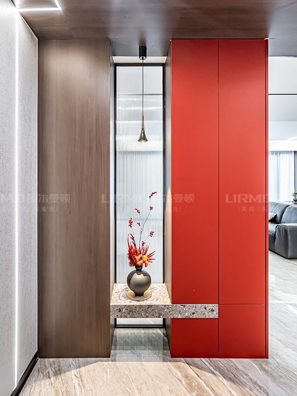 入戶端景做紅黑撞色設計,搭配水波紋玻璃以及巖板色懸浮臺面,功能性和設計兼顧。