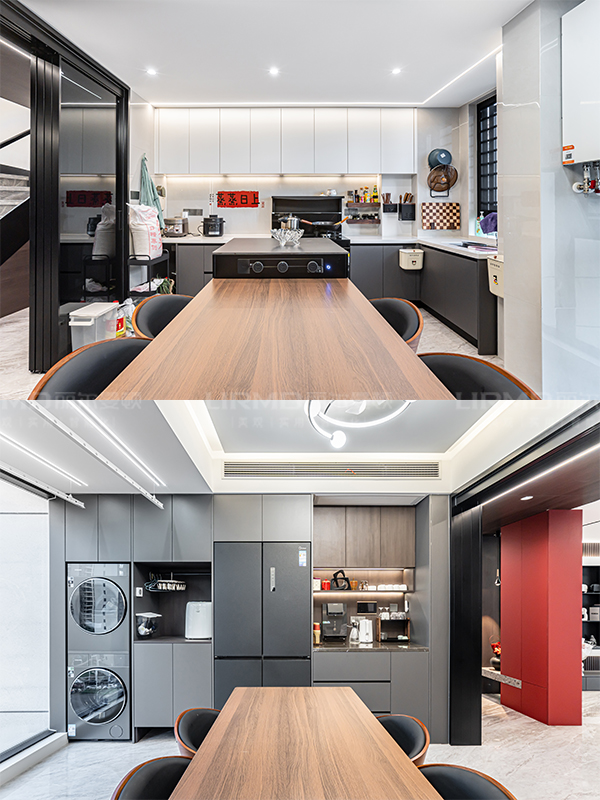 餐廚一體設計,大磚通鋪,四聯動推拉門,開閉自如。餐島臺居中,洄游動線流暢。