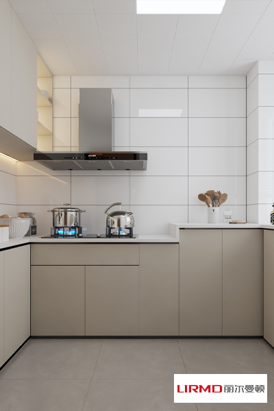 廚房設(shè)計以簡約大方為主,大面積的淺色瓷磚使用使空間看起來更開闊,
