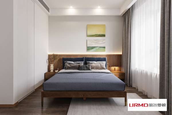 灰色床品,簡單不失品味,木飾床頭散發(fā)出寧靜氣息,光線透過紗簾在臥室自由流轉(zhuǎn),一切都剛剛好。